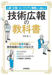 技術広報とは、自社の技術的な取り組みをテックブログや勉強会などを通じて発信し、企業としてのプレゼンスや認知度を高める活動です。技術広報の分野で多くの経験を積む河又さんが、技術広報の役割や始め方を解説した上で、テックブログ、勉強会、カンファレンスへの協賛や登壇、自社イベントの開催などの具体的なノウハウを紹介してくれる『技術広報の教科書』で、主な内容は次の通りです。