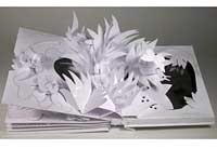・9~10ページ目:池のほとりの花やトンボの楽園で、ついに白い軌跡の正体と出会います。(このページには、なんと立体のままのしかけがあります。このページは箱型になっていて、立体しかけや重なり合った紙のしかけが、その中に納まるという、ちょっと反則技の新発想しかけになっています。)